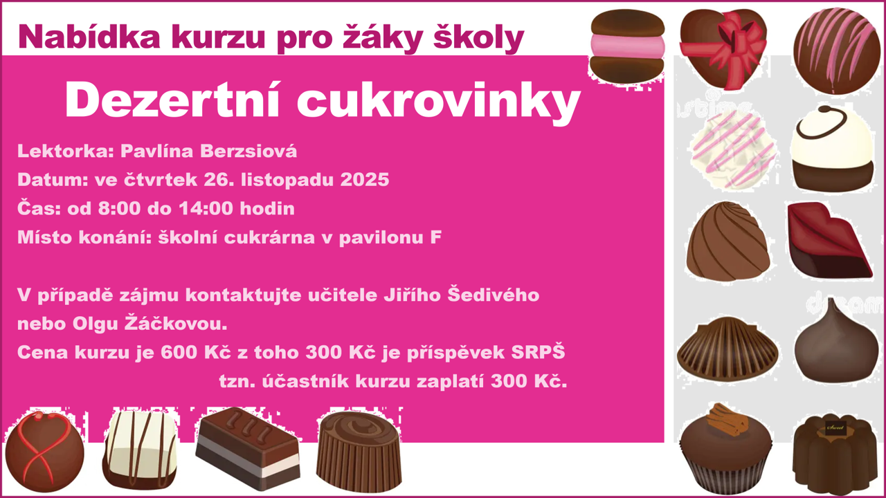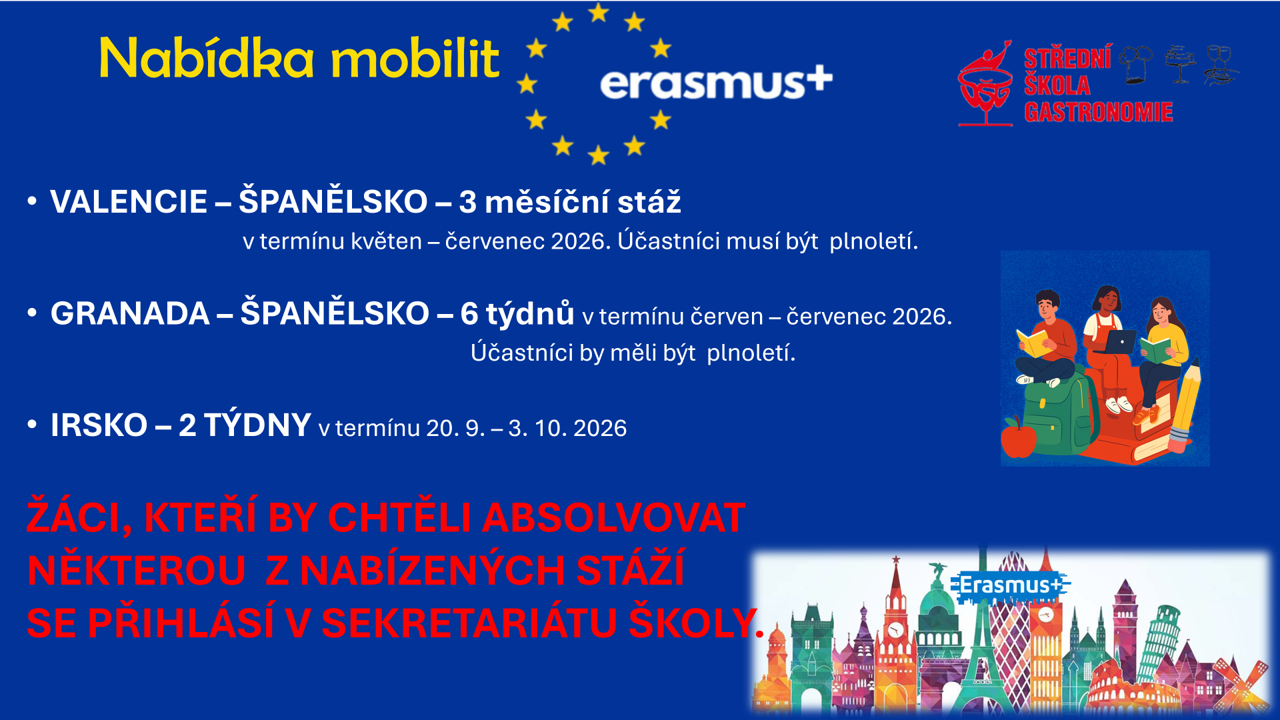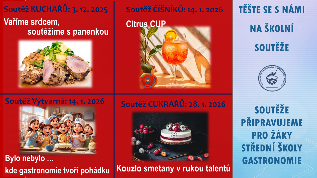 Nabízíme Vám vzdělání v oborech kuchař, číšník, cukrář, gastronomie a podnikání. Můžete získat výuční list či maturitu v denním studiu nebo ve studiu nástavbovém.