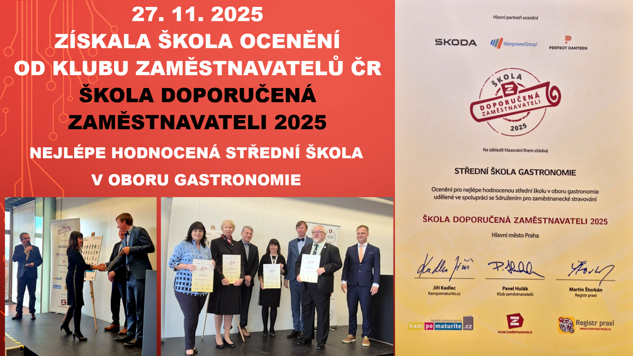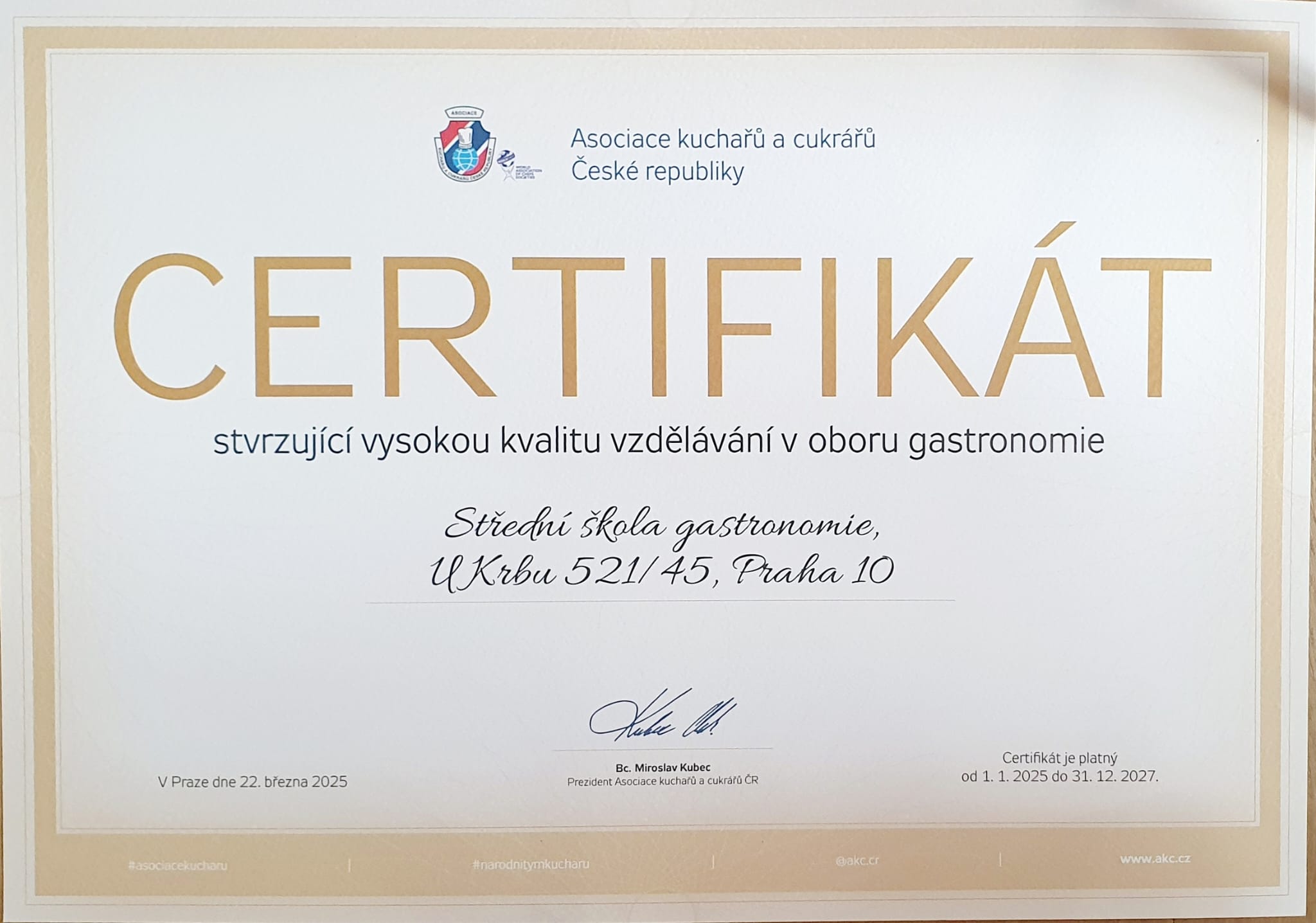 22. března 2025 na celostátní valné hromadě spolku převzala ředitelka školy Mgr. Kateřina Mrvová Certifikát stvrzující vysokou kvalitu vzdělávání v oboru gastronomie z rukou prezidenta Asociace kuchařů a cukrářů ČR pana Bc. Miroslava Kubece. Tento certifikát získáváme opakovaně jako jediná pražská škola zřízená HMP.
