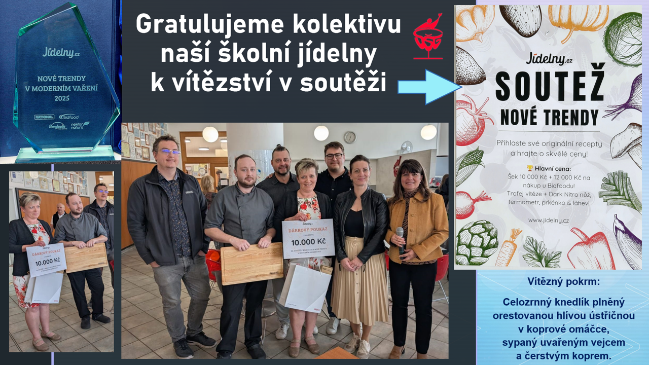 Ve školním roce 2024/25 se poprvé naše jídelna přihlásila do soutěže pořádané společností „Jídelny.cz“. Jednalo se o téma „Nové trendy v moderním vaření 2025“. Školy soutěžily se svými originálními recepty.