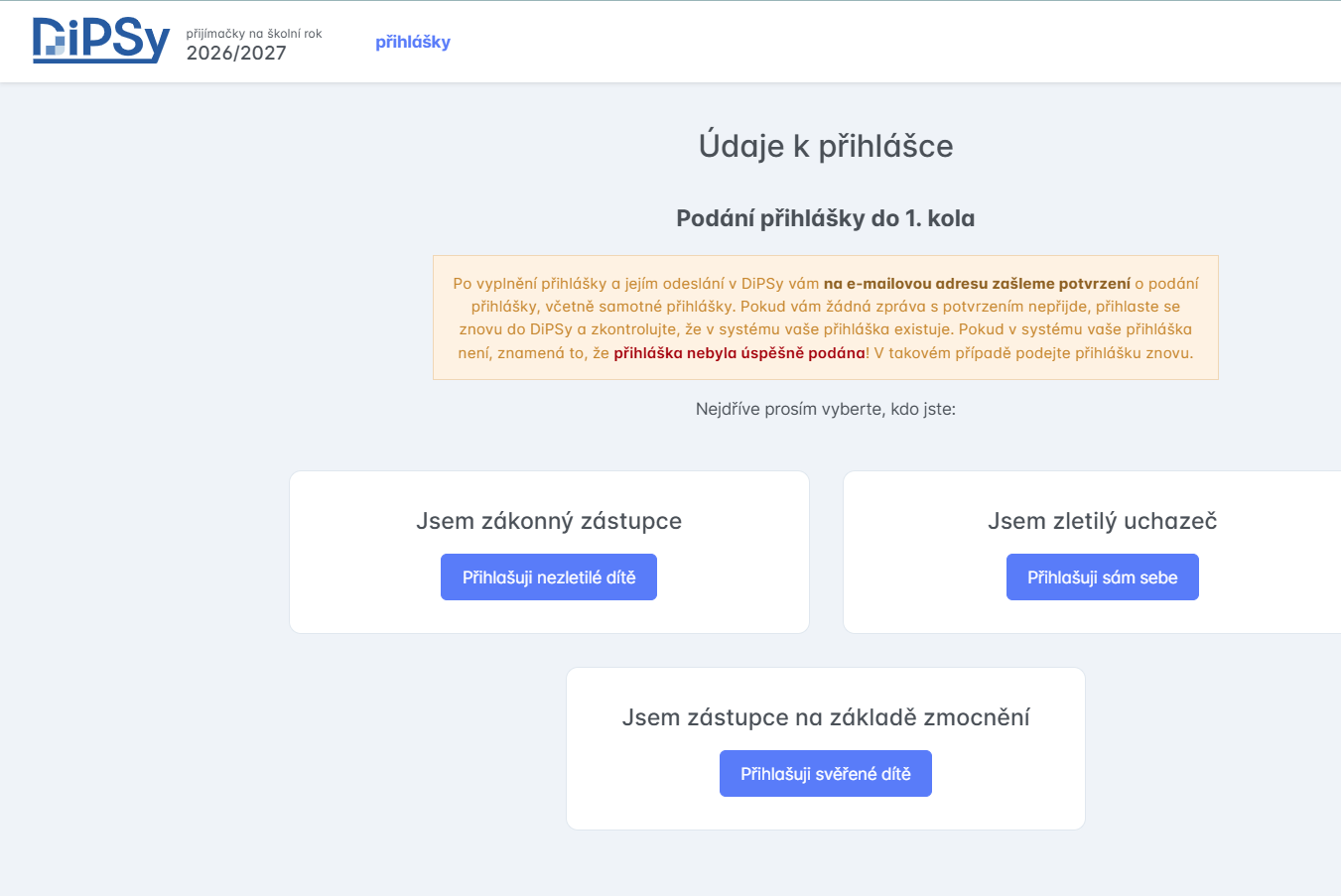 Systém pro podávání elektronických přihlášek bude spuštěn na doméně www.dipsy.cz v průběhu ledna 2026. Elektronickou přihlášku bude možné podat od 1. 2. 2026 do 20. 2. 2026. Videonávody ukazující práci se systémem níže.